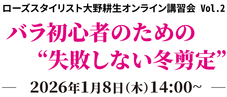 - 講習会名: ローズスタイリスト大野耕生のオンライン講習会Vol2「バラ初心者のための“失敗しない冬剪定”」