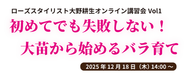 - 講習会名: ローズスタイリスト大野耕生のオンライン講習会Vol1「初めてでも失敗しない!大苗から始めるバラ育て」